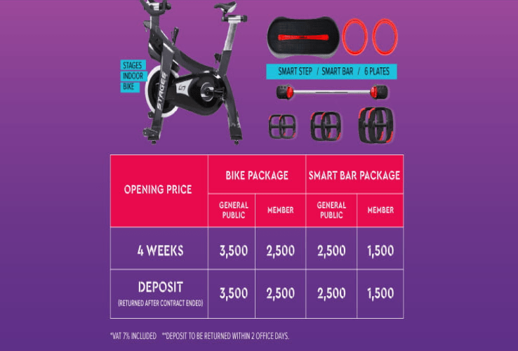- Bike Package: You can rent one (1) STAGES Indoor Bike for 2 weeks at 2,000฿ or for 4 weeks at ONLY 2,500฿. Deposit for Bike Package is 2,500฿.